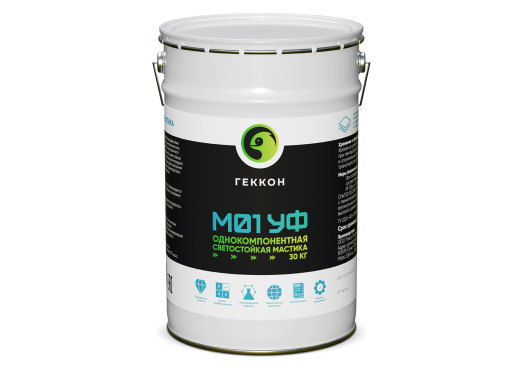 Мастика Геккон М01 УФ обладает высокой устойчивостью к ультрафиолетовому излучению и атмосферным воздействиям. Это обеспечивает длительный срок службы покрытия на открытых поверхностях без потери эластичности, цвета и защитных свойств, в отличие от битумных и акриловых аналогов.